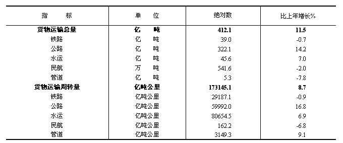 全年貨物運(yùn)輸總量412億噸,比上年增長(zhǎng)11.5%。貨物運(yùn)輸周轉(zhuǎn)量173145億噸公里,增長(zhǎng)8.7%。全年規(guī)模以上港口完成貨物吞吐量97.4億噸,比上年增長(zhǎng)6.8%,其中外貿(mào)貨物吞吐量30.1億噸,增長(zhǎng)8.8%。規(guī)模以上港口集裝箱吞吐量17651萬(wàn)標(biāo)準(zhǔn)箱,增長(zhǎng)8.1%。