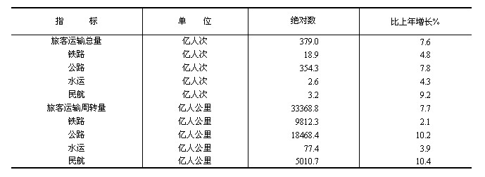 全年旅客運(yùn)輸總量379億人次,比上年增長(zhǎng)7.6%。旅客運(yùn)輸周轉(zhuǎn)量33369億人公里,增長(zhǎng)7.7%。