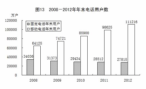 全年完成郵電業(yè)務(wù)總量[14]15022億元,比上年增長(zhǎng)13.0%。其中,郵政業(yè)務(wù)總量2037億元,增長(zhǎng)26.7%;電信業(yè)務(wù)總量12985億元,增長(zhǎng)11.1%。郵政業(yè)全年完成郵政函件業(yè)務(wù)70.74億件,包裹業(yè)務(wù)0.69億件,快遞業(yè)務(wù)量56.85億件。電信業(yè)全年局用交換機(jī)容量新增478萬(wàn)門,總?cè)萘?3906萬(wàn)門;新增移動(dòng)電話交換機(jī)容量[15]11234萬(wàn)戶,達(dá)到182870萬(wàn)戶。年末固定電話用戶27815萬(wàn)戶,其中,城市電話用戶18893萬(wàn)戶,農(nóng)村電話用戶8922萬(wàn)戶。新增移動(dòng)電話用戶12590萬(wàn)戶,年末達(dá)到111216萬(wàn)戶,其中3G移動(dòng)電話用戶[16]23280萬(wàn)戶。年末全國(guó)固定及移動(dòng)電話用戶總數(shù)達(dá)到139031萬(wàn)戶,比上年末增加11896萬(wàn)戶。電話普及率達(dá)到103.2部/百人。互聯(lián)網(wǎng)上網(wǎng)人數(shù)5.64億人,其中寬帶上網(wǎng)人數(shù)5.30億人;ヂ(lián)網(wǎng)普及率達(dá)到42.1%。