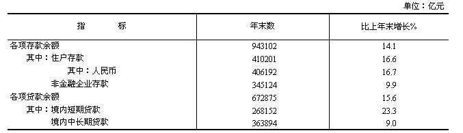 年末全部金融機(jī)構(gòu)本外幣各項(xiàng)存款余額94.3萬(wàn)億元,比年初增加11.6萬(wàn)億元,其中人民幣各項(xiàng)存款余額91.8萬(wàn)億元,增加10.8萬(wàn)億元。全部金融機(jī)構(gòu)本外幣各項(xiàng)貸款余額67.3萬(wàn)億元,增加9.1萬(wàn)億元,其中人民幣各項(xiàng)貸款余額63.0萬(wàn)億元,增加8.2萬(wàn)億元。全年社會(huì)融資規(guī)模[17]為15.8萬(wàn)億元,按可比口徑計(jì)算,比上年多2.9萬(wàn)億元。