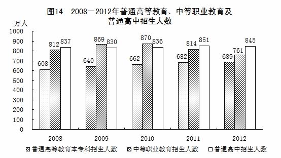 全年研究生教育招生59.0萬(wàn)人,在學(xué)研究生172.0萬(wàn)人,畢業(yè)生48.6萬(wàn)人。普通高等教育本?普猩688.8萬(wàn)人,在校生2391.3萬(wàn)人,畢業(yè)生624.7萬(wàn)人。各類中等職業(yè)教育招生761.0萬(wàn)人,在校生2120.3萬(wàn)人,畢業(yè)生673.6萬(wàn)人。全國(guó)普通高中招生844.6萬(wàn)人,在校生2467.2萬(wàn)人,畢業(yè)生791.5萬(wàn)人。全國(guó)初中招生1570.8萬(wàn)人,在校生4763.1萬(wàn)人,畢業(yè)生1660.8萬(wàn)人。普通小學(xué)招生1714.7萬(wàn)人,在校生9695.9萬(wàn)人,畢業(yè)生1641.6萬(wàn)人。特殊教育招生6.6萬(wàn)人,在校生37.9萬(wàn)人,畢業(yè)生4.9萬(wàn)人。幼兒園在園幼兒3685.8萬(wàn)人。