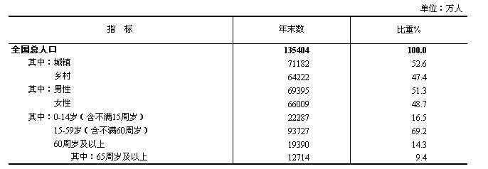 年末全國(guó)大陸總?cè)丝跒?35404萬(wàn)人,比上年末增加669萬(wàn)人,其中城鎮(zhèn)人口為71182萬(wàn)人,占總?cè)丝诒戎貫?2.6%,比上年末提高1.3個(gè)百分點(diǎn)。全年出生人口1635萬(wàn)人,出生率為12.10‰;死亡人口966萬(wàn)人,死亡率為7.15‰;自然增長(zhǎng)率為4.95‰。出生人口性別比為117.70。0-14歲(含不滿15周歲)人口22287萬(wàn)人,占總?cè)丝诘?6.5%,比上年末提高0.01個(gè)百分點(diǎn);15-59歲(含不滿60周歲)勞動(dòng)年齡人口93727萬(wàn)人,比上年末減少345萬(wàn)人,占總?cè)丝诘?9.2%,比上年末下降0.60個(gè)百分點(diǎn);60周歲及以上人口19390萬(wàn)人,占總?cè)丝诘?4.3%,比上年末提高0.59個(gè)百分點(diǎn)。全國(guó)人戶分離的人口[25]為2.79億人,其中流動(dòng)人口[26]為2.36億人。