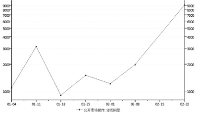 春節(jié)后的一周,央行出手大規(guī);鼗\貨幣達(dá)9100億元人民幣,此舉被市場(chǎng)理解為監(jiān)管層對(duì)國(guó)內(nèi)資金面開(kāi)始進(jìn)行微調(diào),銀行系統(tǒng)和銀行間貨幣市場(chǎng)流動(dòng)性出現(xiàn)拐點(diǎn)!巴鈪R占款較高是央行實(shí)行大規(guī)模回籠資金的主要考慮因素!惫獯筱y行首席宏觀分析師盛宏清預(yù)計(jì),1月新增外匯占款可能達(dá)到6000億元,2月新增外匯占款則在4000億元附近,因此,央行通過(guò)重啟正回購(gòu)防止流動(dòng)性過(guò)度寬松,使M2增速持續(xù)高于目標(biāo)值。
