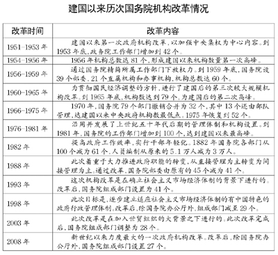 歷史資料顯示,從新中國成立至今,我國已經(jīng)對(duì)國務(wù)院下屬機(jī)構(gòu)的組成和職能做出過12次不同程度的調(diào)整。其中21世紀(jì)以來,國務(wù)院就先后兩次對(duì)政府機(jī)構(gòu)進(jìn)行了較大規(guī)模改革。2003年的政府機(jī)構(gòu)改革,是在加入世貿(mào)組織大背景之下進(jìn)行的。此次改革完成后,國家發(fā)展計(jì)劃委員會(huì)改組為國家發(fā)展和改革委員會(huì),設(shè)立了國務(wù)院國有資產(chǎn)監(jiān)督管理委員會(huì)、中國銀行業(yè)監(jiān)督管理委員會(huì),并組建了商務(wù)部。2008年的政府機(jī)構(gòu)改革力度更大,國務(wù)院正部級(jí)機(jī)構(gòu)減少4個(gè),同時(shí)組建成立工業(yè)和信息化部、交通運(yùn)輸部、國家民用航空局、人力資源和社會(huì)保障部、環(huán)境保護(hù)部、住房和城鄉(xiāng)建設(shè)部。