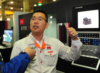 沈陽(yáng)機(jī)床集團(tuán)董事長(zhǎng)關(guān)錫友在向記者介紹數(shù)控設(shè)備。新華社發(fā)(姜冰 攝) |