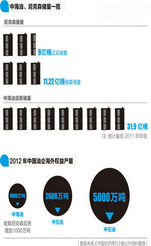 雖然成本巨大,但長遠看來,中海油這次收購的利潤也很豐厚。有媒體引用中石油經(jīng)濟技術(shù)研究院的報告稱,中海油對尼克森的收購,將使其油氣凈產(chǎn)量較2011年增長22%,達到5500萬噸,而其海外權(quán)益油氣產(chǎn)量也將比2012年翻番,達到2000萬噸。