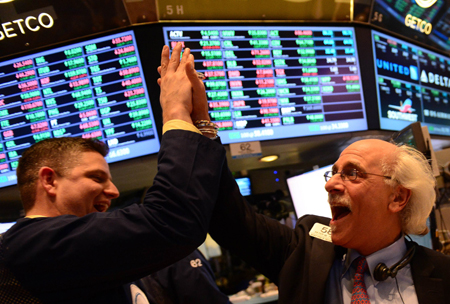 3月5日,在美國紐約證券交易所,兩名交易員在當天交易結束后擊掌相慶。 紐約股市道瓊斯工業(yè)平均指數(shù)當日創(chuàng)出歷史新高。開盤后幾分鐘道指便突破歷史最高收盤價和盤中價。截至收盤,道指首次站上14200點大關,收于14253.77點,漲幅為0.89%。與金融危機期間的2009年3月的低點相比,目前道指已經反彈了一倍以上。