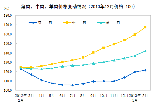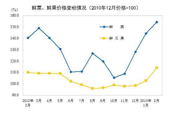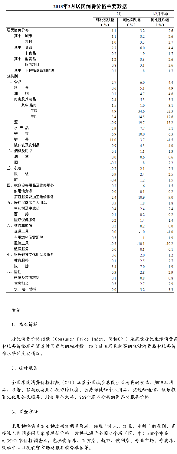 2013年2月份,全國居民消費(fèi)價(jià)格總水平同比上漲3.2%。其中,城市上漲3.2%,農(nóng)村上漲3.3%;食品價(jià)格上漲6.0%,非食品價(jià)格上漲1.9%;消費(fèi)品價(jià)格上漲3.3%,服務(wù)價(jià)格上漲3.1%。