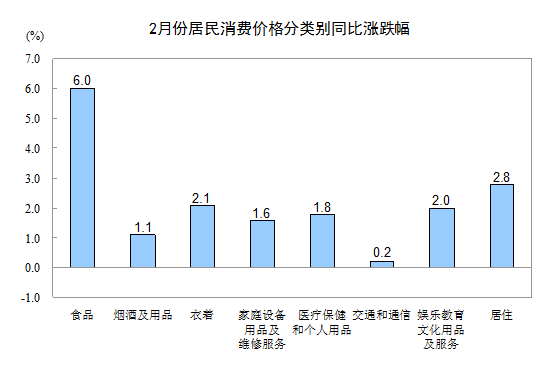 2月份,全國居民消費(fèi)價(jià)格總水平環(huán)比上漲1.1%。其中,城市上漲1.1%,農(nóng)村上漲1.0%;食品價(jià)格上漲2.7%,非食品價(jià)格上漲0.2%;消費(fèi)品價(jià)格上漲1.2%,服務(wù)價(jià)格上漲0.8%。