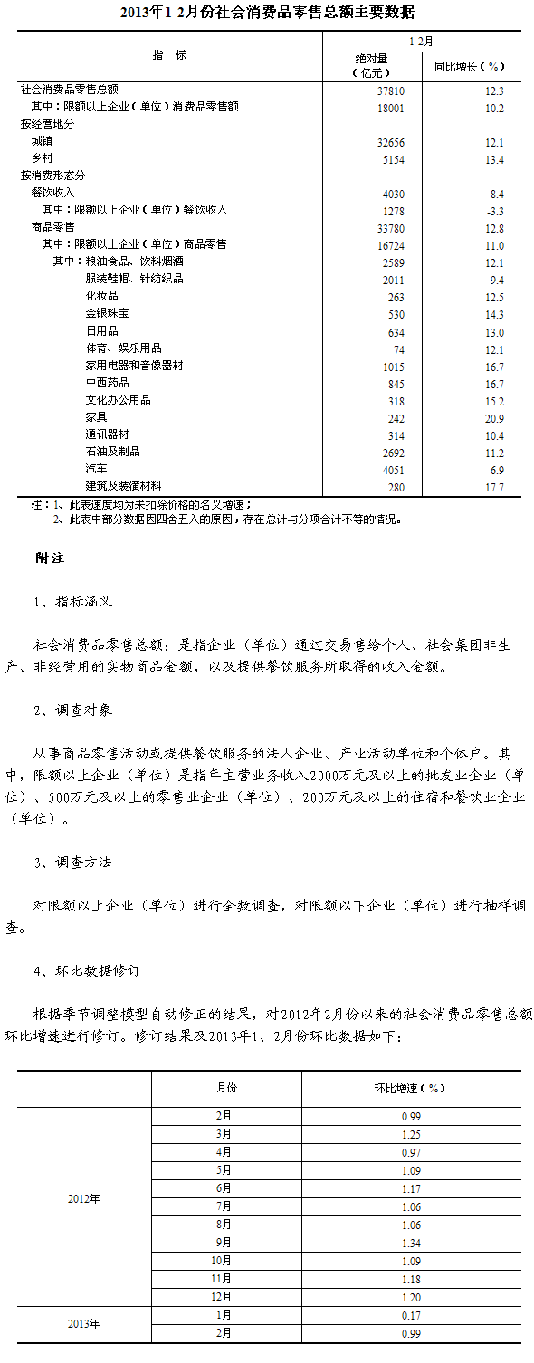 2013年1-2月份,社會消費(fèi)品零售總額37810億元,同比名義增長12.3%(扣除價格因素實際增長10.4%,以下除特殊說明外均為名義增長)。其中,限額以上企業(yè)(單位)消費(fèi)品零售額18001億元,增長10.2%。
