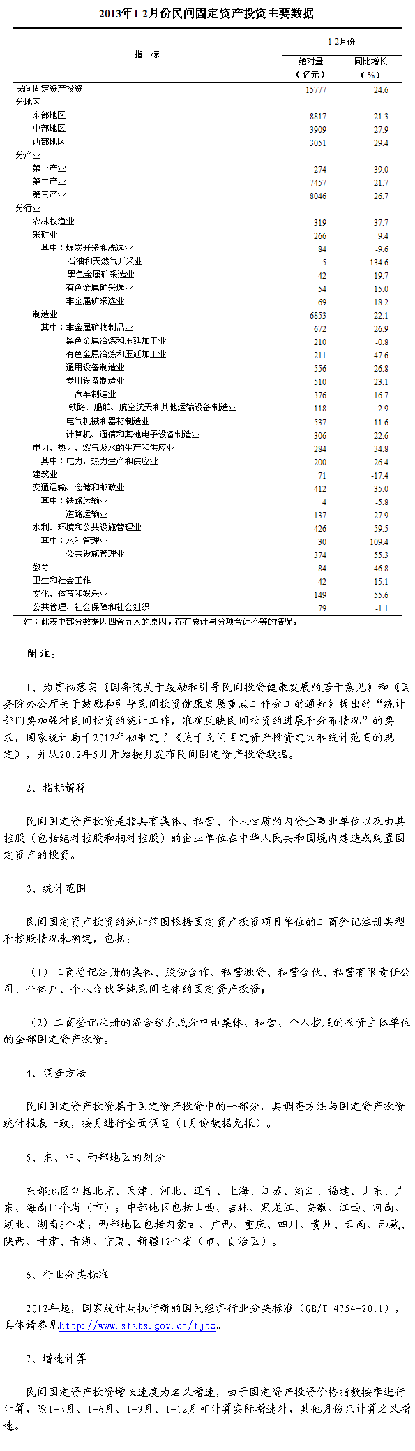 2013年1-2月份,全國(guó)民間固定資產(chǎn)投資15777億元,同比名義增長(zhǎng)24.6%,增速比去年全年回落0.2個(gè)百分點(diǎn)。民間固定資產(chǎn)投資占固定資產(chǎn)投資的比重為61.4%,與去年全年持平。