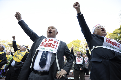 3月12日,日本農(nóng)業(yè)團(tuán)體代表在東京舉行集會(huì),抗議政府將會(huì)在近期同意參加美國(guó)主導(dǎo)的《跨太平洋戰(zhàn)略經(jīng)濟(jì)伙伴協(xié)定》(TPP)談判。圖為集會(huì)者高呼抗議口號(hào)。