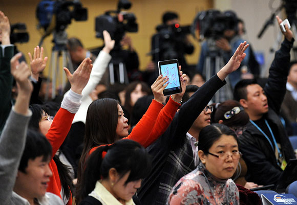 3月13日,十二屆全國(guó)人大一次會(huì)議新聞中心在梅地亞中心多功能廳舉行記者會(huì)。民政部部長(zhǎng)李立國(guó),副部長(zhǎng)姜力、竇玉沛就“保障基本民生,發(fā)展社會(huì)服務(wù)”的相關(guān)問題回答中外記者的提問。圖為記者舉著ipad提問。