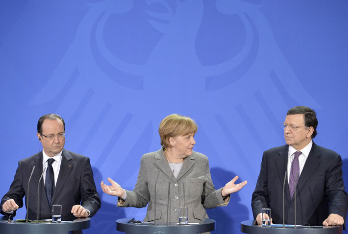 3月18日,法國總統(tǒng)奧朗德(左)、德國總理默克爾(中)和歐盟委員會主席巴羅佐在德國柏林出席歐洲工業(yè)家圓桌會議。新華社/法新 |
