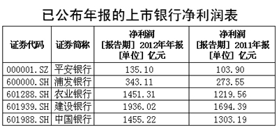 與國有大行相比,股份制銀行仍保持了較高的增速。已發(fā)布業(yè)績快報的興業(yè)銀行、民生銀行和招商銀行的盈利增幅預期均超過20%。已公布年報的平安銀行和浦發(fā)銀行凈利潤分別同比增長約30%和25%。瑞銀證券分析師孫旭預計,2012年股份制和城商行凈利潤將分別同比增長25%和27%。