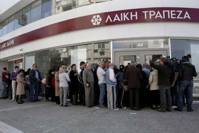 圖為客戶在塞浦路斯第二大銀行Laiki Bank在首都尼科西亞的一家分行門口排隊(duì)等待銀行開業(yè)。