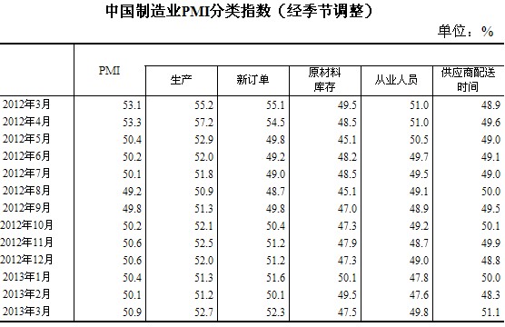 2013年3月,中國制造業(yè)采購經(jīng)理指數(shù)(PMI)為50.9%,比上月上升0.8個百分點,連續(xù)6個月位于臨界點以上。
