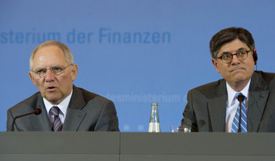 2013年4月9日,美國(guó)新任財(cái)長(zhǎng)雅各布·盧訪問(wèn)德國(guó),會(huì)晤德國(guó)財(cái)長(zhǎng)朔伊布勒(左),商談歐債危機(jī)進(jìn)展、促進(jìn)全球經(jīng)濟(jì)增長(zhǎng)等議題。盧敦促歐洲領(lǐng)導(dǎo)人采取措施刺激經(jīng)濟(jì)增長(zhǎng)。