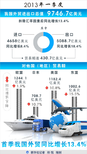 10日,海關(guān)總署發(fā)布的進出口數(shù)據(jù)顯示,今年一季度,我國外貿(mào)進出口總值6.12萬億元,扣除匯率因素同比(下同)增長13.4%。其中出口3.2萬億元,增長18.4%,進口2.92萬億元,增長8.4%。貿(mào)易順差2705億元(折合430.7億美元),與去年同期僅2.1億美元的順差相比大幅擴大。3月當(dāng)月逆差8.8億美元,我國外貿(mào)13個月來首現(xiàn)逆差。