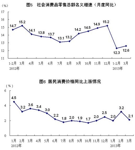 一季度,社會消費品零售總額55451億元,同比名義增長12.4%(扣除價格因素實際增長10.8%),增速比上年同期回落2.4個百分點,比上年全年回落1.9個百分點。其中,限額以上企業(yè)(單位)消費品零售額27045億元,同比增長10.3%。按經(jīng)營單位所在地分,城鎮(zhèn)消費品零售額47894億元,同比增長12.2%;鄉(xiāng)村消費品零售額7557億元,增長13.9%。按消費形態(tài)分,餐飲收入5890億元,同比增長8.5%,增速比上年同期回落4.8個百分點,比上年全年回落5.1個百分點;商品零售49561億元,增長12.9%,分別回落2.1和1.5個百分點。在商品零售中,限額以上企業(yè)(單位)商品零售額25170億元,增長11.1%。其中,汽車類增長6.4%,增速比上年同期回落4.6個百分點;家具類增長22.4%,回落3.0個百分點;家用電器和音像器材類增長16.7%,加快16.1個百分點。3月份,社會消費品零售總額同比名義增長12.6%(扣除價格因素實際增長11.7%),環(huán)比增長1.23%。