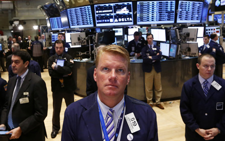 受國際黃金反彈及美國經(jīng)濟(jì)數(shù)據(jù)利好推動,紐約股市從前一交易日的暴跌中反彈,三大股指16日上漲報收。 圖為4月16日,在美國紐約證券交易所,交易員在開盤前為美國波士頓馬拉松爆炸案死難者默哀。