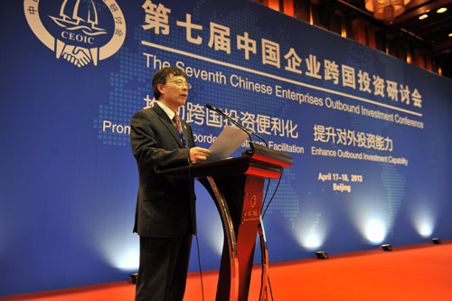 在第七屆中國企業(yè)跨國投資研討會上,中國貿促會會長萬季飛發(fā)表講話。張慧娟