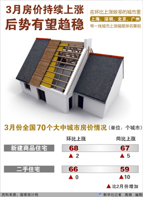 18日,國家統(tǒng)計局發(fā)布3月份70個大中城市住宅銷售價格變動情況,3月房價繼續(xù)前兩月升溫走勢,漲幅繼續(xù)擴大。與此同時,中國土地勘測規(guī)劃院地價所發(fā)布的一季度土地市場監(jiān)測數(shù)據(jù)顯示,受到房地產(chǎn)市場回暖影響,一二線城市中,除哈爾濱外,其他城市一季度住宅地價全部環(huán)比上漲。專家表示,現(xiàn)階段解決房價上漲問題難度較大,但新政將抑制過快上漲勢頭,而新政影響時限將決定于地方政府對新政的執(zhí)行力度?傮w來看,二季度房地產(chǎn)市場將整體呈現(xiàn)量縮價穩(wěn)的態(tài)勢。