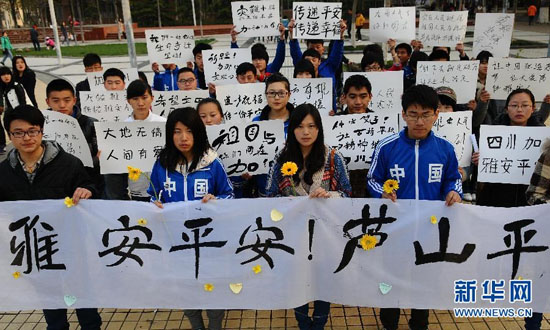 4月20日,山東聊城大學(xué)美術(shù)學(xué)院的大學(xué)生在為雅安地震災(zāi)區(qū)同胞祈福、加油。當(dāng)日8時(shí)02分,四川省雅安市蘆山縣發(fā)生7.0級(jí)地震。災(zāi)情牽動(dòng)著億萬同胞的心,人們用不同的方式為雅安地震災(zāi)區(qū)人民祈福,哀悼地震遇難同胞。截至20日16時(shí)40分,雅安蘆山地震已造成四川113人死亡。新華社發(fā)
