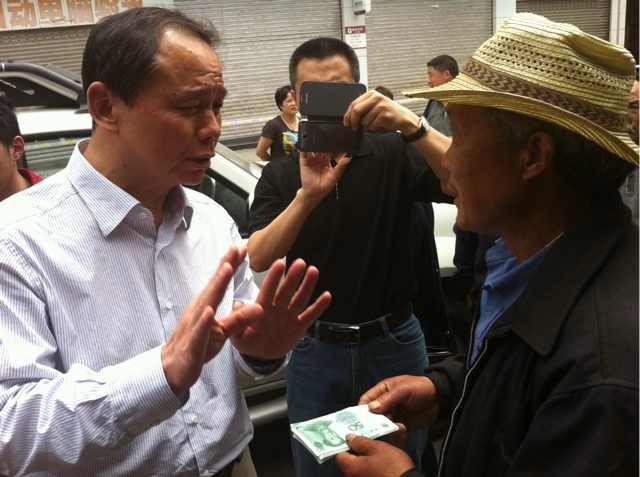 | 人保集團(tuán)董事長吳焰親手將第一筆5000元賠款送到了客戶駱瑞森手中。劉周維/攝 |