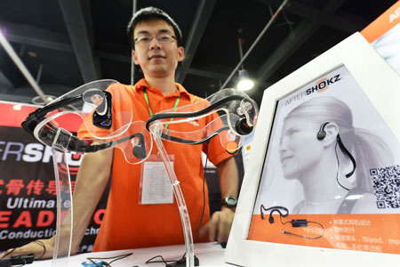 第七屆中國(guó)杭州電子信息博覽會(huì)近日在杭州和平國(guó)際會(huì)展中心舉行。圖為工作人員在展示兩款不傷聽力的“雙耳開放骨傳導(dǎo)式耳機(jī)”。