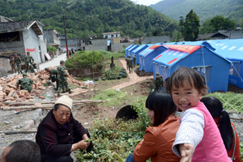 4月25日,蘆山縣寶盛鄉(xiāng)玉溪村1100多名村民全部入住由武警四川總隊一支隊為他們支起的187頂帳篷。村頭干活的魏大媽高興地說,這是我們的“玉溪新村”。新華社發(fā) (劉海山/攝) |