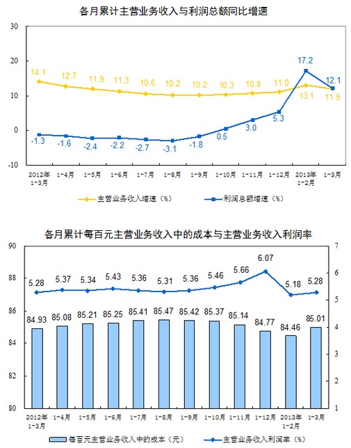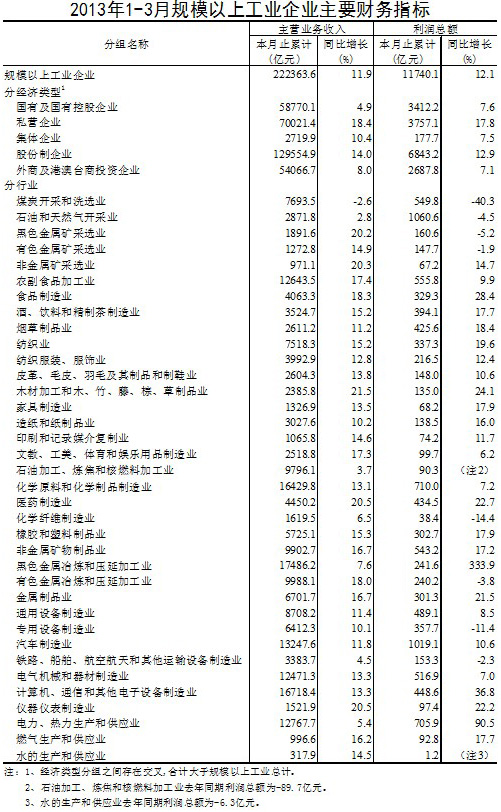 1-3月份全國規(guī)模以上工業(yè)企業(yè)實(shí)現(xiàn)利潤11740億元,比去年同期增長12.1%,增幅比1-2月份回落5.1個百分點(diǎn)。3月當(dāng)月實(shí)現(xiàn)利潤4649億元,比去年同期增長5.3%。