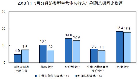 1-3月份在規(guī)模以上工業(yè)企業(yè)中,國有及國有控股企業(yè)實(shí)現(xiàn)利潤3412億元,比去年同期增長7.6%;集體企業(yè)實(shí)現(xiàn)利潤178億元,增長7.5%;股份制企業(yè)實(shí)現(xiàn)利潤6843億元,增長12.9%;外商及港澳臺商投資企業(yè)實(shí)現(xiàn)利潤2688億元,增長7.1%;私營企業(yè)實(shí)現(xiàn)利潤3757億元,增長17.8%。