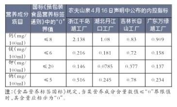 農(nóng)夫山泉內(nèi)控指標(biāo)與《食品營(yíng)養(yǎng)標(biāo)簽國(guó)標(biāo)》中“0”界值的對(duì)比