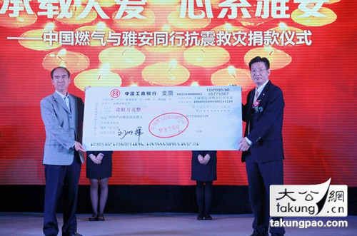 4月26日,中國(guó)燃?xì)庠谏钲谂e行2013財(cái)年工作會(huì)議,并在現(xiàn)場(chǎng)舉行了“承載大愛(ài),心系雅安——中國(guó)燃?xì)馀c雅安同行”的抗震救災(zāi)捐款儀式。集團(tuán)執(zhí)行總裁黃勇代表中國(guó)燃?xì)庥H自將100萬(wàn)元善款交到了深圳市政協(xié)副主席、深圳市慈善會(huì)副會(huì)長(zhǎng)姚欣耀的手中。