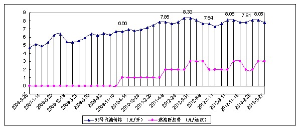 2011年2月20日,本市93號(hào)汽油價(jià)格達(dá)到7.45元/升,超過(guò)租價(jià)油價(jià)聯(lián)動(dòng)機(jī)制啟動(dòng)點(diǎn)7.10元/升?紤]價(jià)格宏觀調(diào)控情況,未進(jìn)行租價(jià)調(diào)整,繼續(xù)采取加收燃油附加費(fèi)方式。2011年2月以來(lái),本市根據(jù)油價(jià)變動(dòng),4次上調(diào)2次下調(diào)燃油附加費(fèi)標(biāo)準(zhǔn)。