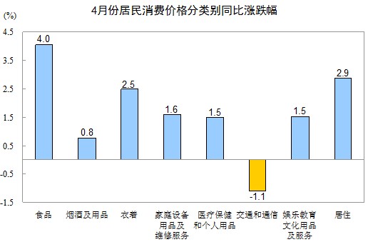4月份,全國(guó)居民消費(fèi)價(jià)格總水平環(huán)比上漲0.2%。其中,城市上漲0.3%,農(nóng)村上漲0.1%;食品價(jià)格上漲0.4%,非食品價(jià)格上漲0.2%;消費(fèi)品價(jià)格上漲0.2%,服務(wù)價(jià)格上漲0.3%。