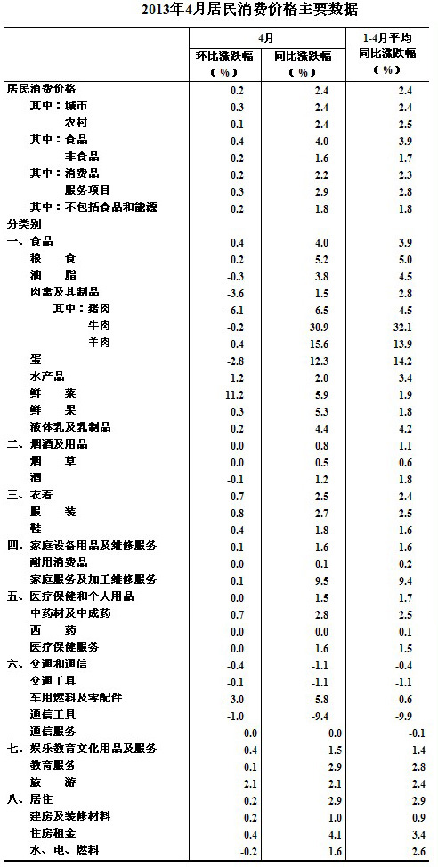 2013年4月份,全國(guó)居民消費(fèi)價(jià)格總水平同比上漲2.4%。其中,城市上漲2.4%,農(nóng)村上漲2.4%;食品價(jià)格上漲4.0%,非食品價(jià)格上漲1.6%;消費(fèi)品價(jià)格上漲2.2%,服務(wù)價(jià)格上漲2.9%。1-4月平均,全國(guó)居民消費(fèi)價(jià)格總水平比去年同期上漲2.4%。