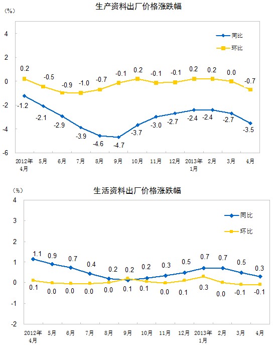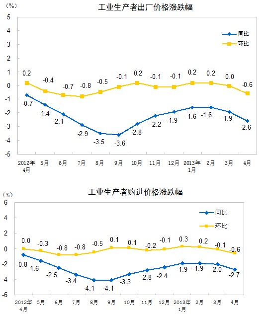 2013年4月份,全國工業(yè)生產(chǎn)者出廠價格同比下降2.6%,環(huán)比下降0.6%。工業(yè)生產(chǎn)者購進價格同比下降2.7%,環(huán)比下降0.6%。1-4月平均,工業(yè)生產(chǎn)者出廠價格同比下降2.0%,工業(yè)生產(chǎn)者購進價格同比下降2.1%。