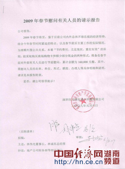 近日,一封長達(dá)10多頁的匿名信件被曝光,該信件主要內(nèi)容為深圳萬澤地產(chǎn)2008年中秋節(jié)前至今,多年向北京市、深圳市多部門多官員送禮的請(qǐng)示報(bào)表與執(zhí)行清單。其中該清單中明確注明送禮方式為贈(zèng)送購物卡和現(xiàn)金兩種形式,對(duì)收禮人員的名單、單位、形式、額度、辦理人等具體明細(xì)均有說明。在這些報(bào)表的右下方,有該公司公章與萬澤地產(chǎn)董事長林偉光的批示!
