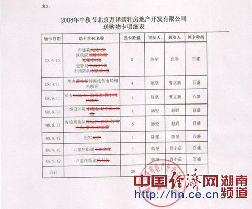 在2008年中秋節(jié)萬澤地產(chǎn)分公司即北京萬澤碧軒房地產(chǎn)開發(fā)有限公司贈(zèng)送購物卡明細(xì)表里可以清晰的看到,9月10日,贈(zèng)送市建委沈處、區(qū)政府王秘書、張秘書、交管局王局長等共4張;9月11日,贈(zèng)送海淀質(zhì)檢站閻站長、曲站長、劉某某、董某、趙某某等共8張;9月12日,贈(zèng)送八里莊街道王副主任、八里莊街道楊科長等共3張……