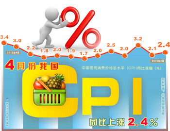 國家統(tǒng)計局9日公布,4月份全國居民消費價格總水平(CPI)同比上漲2.4%,同比漲幅比3月份擴大0.3個百分點,略高于此前市場2.2%至2.3%的預(yù)期,環(huán)比也由3月份的環(huán)比下降轉(zhuǎn)為4月份的環(huán)比上漲0.2%。多方分析認為,鮮菜價格上漲較多是推動4月份CPI上漲的主要原因,受制于經(jīng)濟回升乏力,二季度物價將保持小幅平穩(wěn)上漲態(tài)勢。但是,考慮到豬肉價格很可能從三季度開始顯著上行,國內(nèi)外貨幣環(huán)境也依舊寬松,下半年物價加速上漲的概率仍然較大。