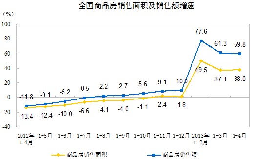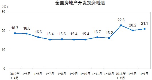 2013年1-4月份,全國(guó)房地產(chǎn)開發(fā)投資19180億元,同比名義增長(zhǎng)21.1%,增速比1-3月份提高0.9個(gè)百分點(diǎn)。其中,住宅投資13121億元,增長(zhǎng)21.3%,增速提高0.2個(gè)百分點(diǎn),占房地產(chǎn)開發(fā)投資的比重為68.4%。