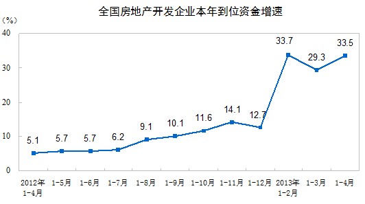 1-4月份,房地產(chǎn)開發(fā)企業(yè)到位資金35602億元,同比增長(zhǎng)33.5%,增速比1-3月份提高4.2個(gè)百分點(diǎn)。其中,國(guó)內(nèi)貸款6618億元,增長(zhǎng)26.8%;利用外資163億元,增長(zhǎng)28.5%;自籌資金12952億元,增長(zhǎng)16.2%;其他資金15869億元,增長(zhǎng)55.9%。在其他資金中,定金及預(yù)收款9782億元,增長(zhǎng)61.9%;個(gè)人按揭貸款4373億元,增長(zhǎng)67.8%。