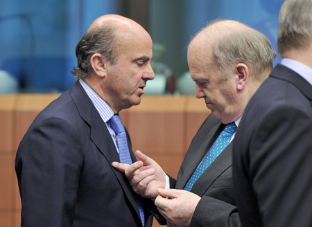 西班牙經(jīng)濟與競爭力部長路易斯·德金多斯(左)13日在歐盟總部與愛爾蘭財長邁克爾·努南交談。當(dāng)日,歐元區(qū)財長會在布魯塞爾舉行,會議將批準(zhǔn)對希臘和葡萄牙的最新一筆救助資金,希臘將獲得約75億歐元,葡萄牙將獲得20億歐元。