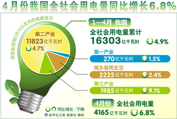此外,受高耗能產(chǎn)業(yè)用電增長拉動(dòng),4月重工業(yè)用電量繼續(xù)回升1.5個(gè)百分點(diǎn)。據(jù)歐陽昌裕介紹,1-4月份四大高耗能產(chǎn)業(yè)用電量累計(jì)增幅為4.9%,其中4月份同比增長4.1%,比3月份回升了3.2個(gè)百分點(diǎn)。