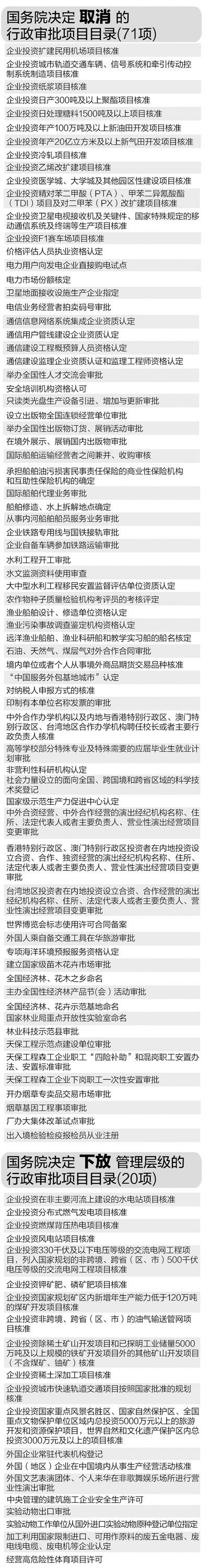 從具體項目看,主要有五種情況:一是投資審批事項。如取消發(fā)展改革委“企業(yè)投資乙烯改擴建項目核準(zhǔn)”,下放其“企業(yè)投資風(fēng)電站項目核準(zhǔn)”、“企業(yè)投資城市快速軌道交通項目核準(zhǔn)”等。二是涉及企事業(yè)單位、社會組織生產(chǎn)經(jīng)營和業(yè)務(wù)活動的事項。如取消稅務(wù)總局“對納稅人申報方式的核準(zhǔn)”、能源局“電力市場份額核定”、水利部“水利工程開工審批”、教育部“民辦學(xué)校聘任校長核準(zhǔn)”等。三是涉及企事業(yè)單位和個人資質(zhì)資格許可認(rèn)定的事項。如取消科技部“非營利性科研機構(gòu)認(rèn)定”、商務(wù)部“機電產(chǎn)品國際招標(biāo)機構(gòu)資格審批”、林業(yè)局“全國經(jīng)濟林花木之鄉(xiāng)命名”等。四是評比達(dá)標(biāo)表彰評估和相關(guān)檢查活動。如取消住房城鄉(xiāng)建設(shè)部“城鎮(zhèn)房屋拆遷管理規(guī)范化考核”、人力資源社會保障部“留學(xué)人員創(chuàng)業(yè)園評估”等。五是行政事業(yè)性收費項目。如取消工業(yè)和信息化部“電子工程概預(yù)算人員培訓(xùn)費”等。此外,還有一些設(shè)立審批時的情況已發(fā)生變化、現(xiàn)在沒必要再審批的事項,以及一些屬于機關(guān)內(nèi)部事務(wù)審批、需要減少工作環(huán)節(jié)的事項。