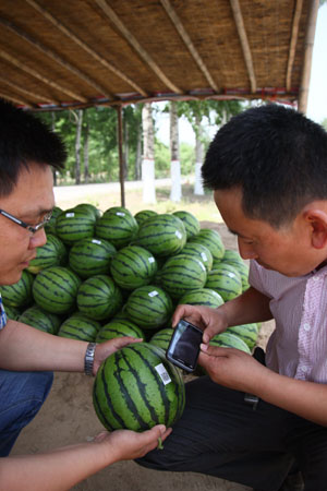 時下,正是西瓜種植大縣——河北省阜城縣“漫河牌”西瓜上市的季節(jié),每一個即將成熟的西瓜上都貼有二維碼,消費者購買時用手機(jī)掃描二維碼,就可獲知西瓜的產(chǎn)地、品種、生產(chǎn)標(biāo)準(zhǔn)、授粉日期、種植戶名稱等內(nèi)容,實現(xiàn)對西瓜的追根溯源。目前,阜城縣4萬畝西瓜已有60%采用了二維碼技術(shù)。 |