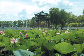 巴彥西郊公園內(nèi)有兩個較大的人工湖內(nèi),每逢盛夏來臨,湖內(nèi)百蓮盛開,景色蔚為壯觀,荷塘溢彩,蓮影婆娑,微風(fēng)拂面,暗香浮動,蓮風(fēng)荷語,百媚萬種。湖內(nèi)有島,島中有亭,似鶴而立,展翅欲飛。湖上曲橋,別致通幽,錯落有致,令人心曠神怡。湖的西側(cè),建有烈士陵園,園內(nèi)有打響中共領(lǐng)導(dǎo)的武裝抗日第一槍的巴彥抗日游擊隊總指揮張甲洲烈士紀(jì)念碑和雕像,大樹蔽天,甬路相通。湖東北側(cè)是一座古城門,人們稱作阜財門,登上城門;放眼四周,路旁花團錦簇,廣場內(nèi)舞者翩翩,賞荷人絡(luò)繹不絕,景色如畫,美不勝收。