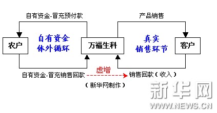 萬福生科在財務造假中,首先借用農戶的身份證,為他們開立個人銀行賬戶,但這些賬戶卻是由萬福生科來控制。公司將自有資金打到這些個人賬戶中,冒充為“預付給農戶的收購款”;而后,再將資金從農戶的個人賬戶上打回給公司,冒充為“客戶的銷售回款”。